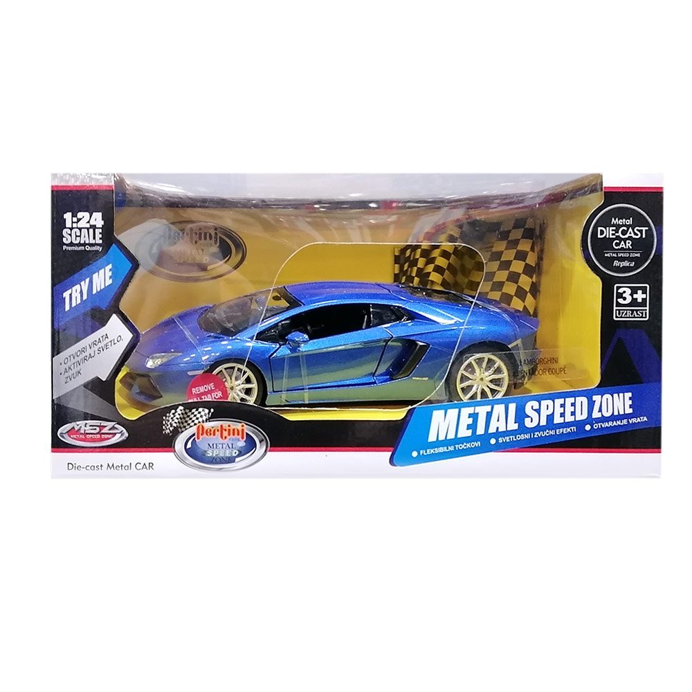 Metalni automobil 1:24-sa zvučnim i svetlosnim efektima. Automobil se pokreće po prinicpu POVUCI-PUSTI, prednja vrata se mogu otvoriti, kao i hauba i gepek. Prilikom otvaranja vrata aktivira se zvuk alarma, a prilikom pokretanja autmobila pale se farovi. Dimenzija pakovanja:24,5×13,5x12cm.