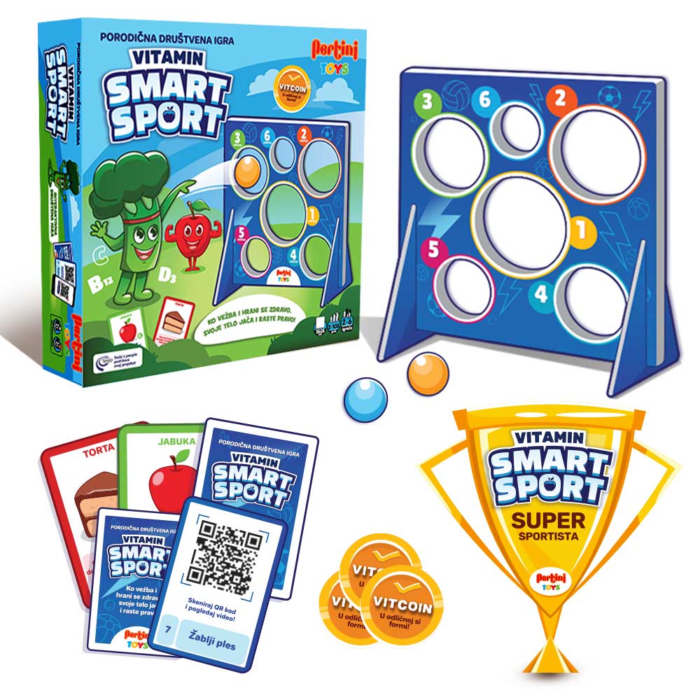 Igra sadrži: table za igru, pehar od kartona, 40 kartica sa zdravom hranom, 1 kartica sa QR kodom koji vodi do pehara, 20 kartica sa nezdravom hranom, 2 loptice, 14 kartica sa QR kodovima sa instrukcijama za vežbe, 36 vitokena i uputstvo. Igra počinje postavkom panela za igru koji na sebi ima 6 otvora različite veličine, kroz koje je potrebno ubaciti lopticu sa određene razdaljine. U zavisnosti kroz koji okvir ubacite lopticu, izlačite od 1 do 6 kartica iz špila. Nakon što igrač izvuče 3 vitamina iz špila stiče uslov da uradi vežbu. Na karticama sa vežbama nalaze se QR kodovi pomoću kojih igrači mogu pogledati upuststvo za izvođenje vežbi. Dok radite vežbu potrebno je da izgovarate imena voća i povrća koje sadrži vitamine koje ste prethodno izvukli na karticama. Ukoliko igraju 2 igrača, kontrlor je osoba naspram vas, dok ukoliko igra više igrača, kontrolor je osoba sa vaše desne strane. Nakon urađene vežbe ili pokušaja/izvedbe, igrač dobija VITOKEN. Pobednik igre je igrač koji prvi sakupi 6 VITOKENA. Vitamin Smart sport edukativno-zabavna igra koja podstiče fizičku aktivnost, razvoj inteligencije, koncentraciju, kao i finu i krupnu motoriku. Dimenzije pakovanja: 30 x 30 x 6 cm, Uzrast: 3-103 godine