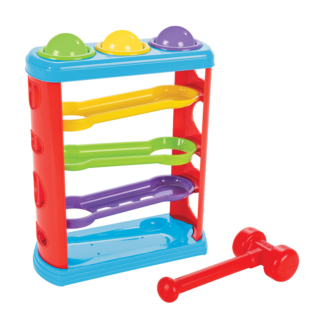 Sadrži 3 lopte koje čekićem ubacujete kroz rupe,a one se dalje same kotrljaju niz lavirint.Tokom igre dete će razvijati krupnu motoriku,ali i opažanje i logičko zaključivanje.Naučiće 5 boja.