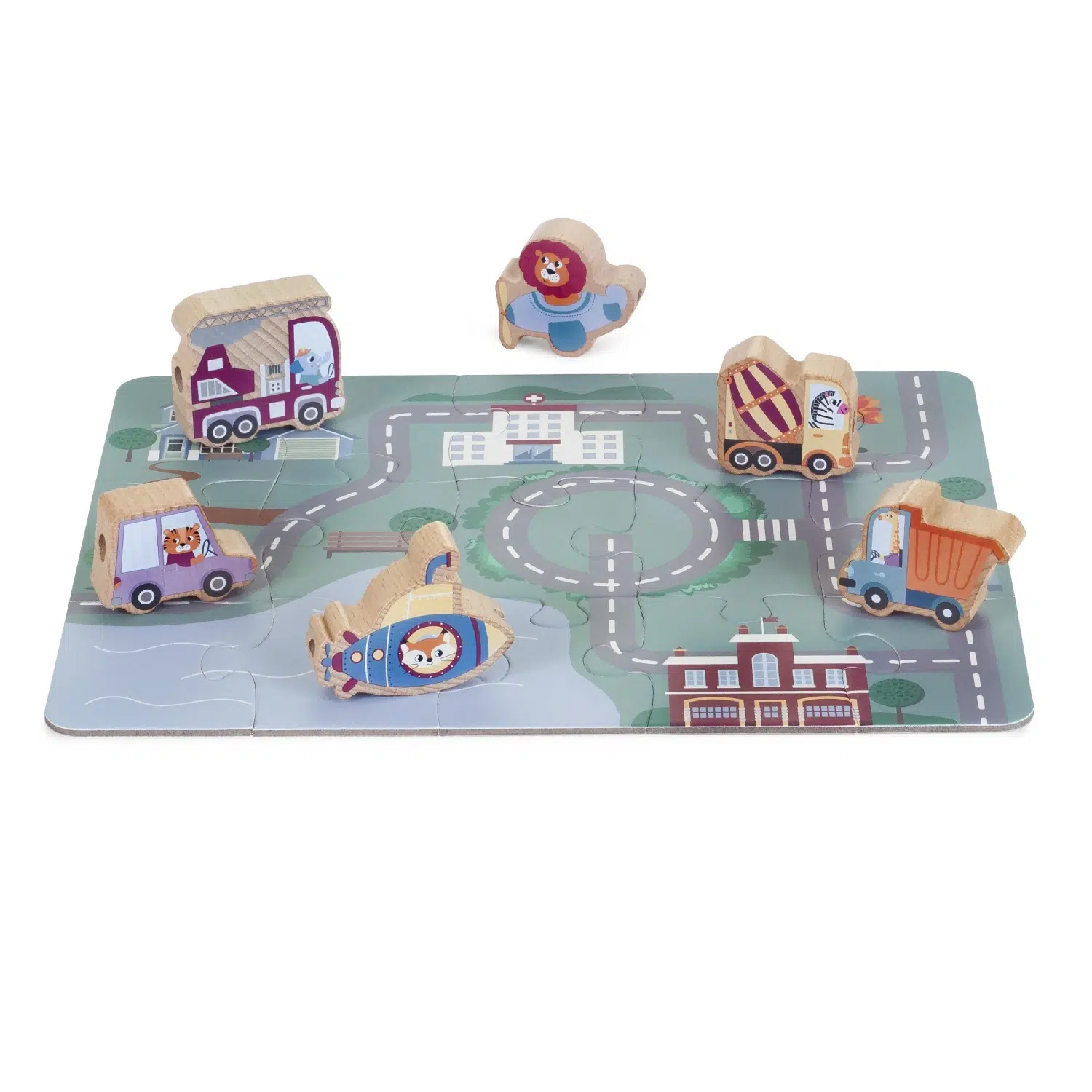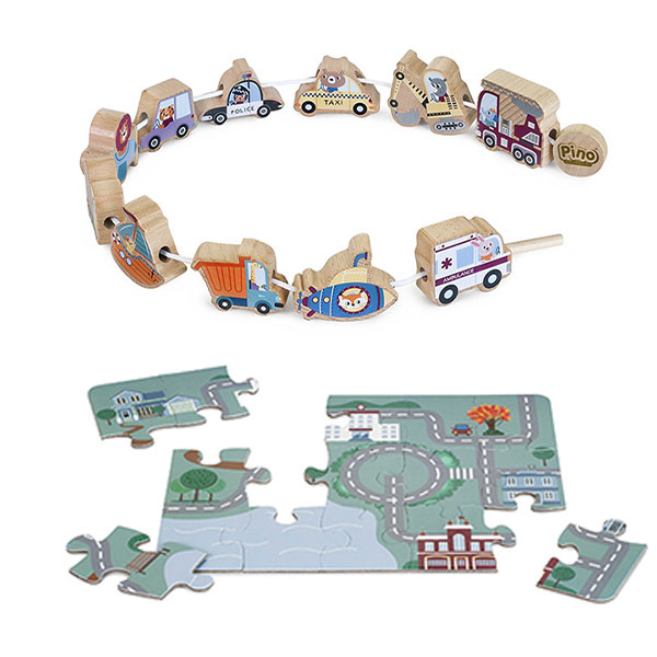 Pino Nizalica GRAD sadrži i kartonsku podlogu koja se sastavlja i predstavlja ilustrovanu mapu grada na kojoj dete može da postavlja i voza autiće, uči kako se koji zove i čemu služi.