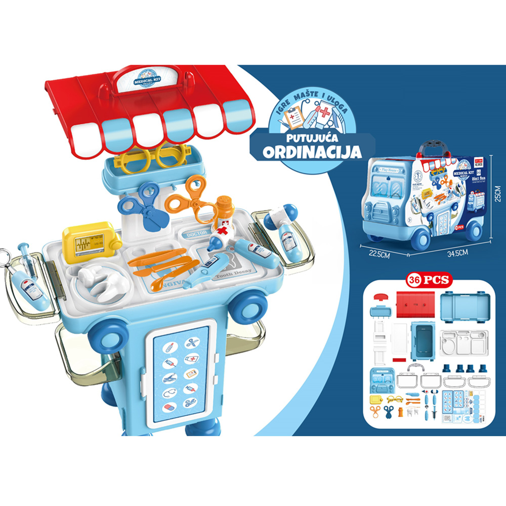 Interaktivni set koji približava deci realan svet na njima prihvatljiv i zanimljiv način – kroz igru! Interaktivni set podstiče razvoj socijalnih, kognitivnih i manipulativnih sposobnosti deteta. Neka vaše dete uživa a pritom i nesvesno gradi svoju ličnost i razvija sposobnosti novi interaktivni set. Set putujuća ordinacija je u vidu putujućeg kofera na točkiće koji sadrži komplet aksesoara od plastike za male doktore, poput makazica, naočara, šprica, zubića, toplomera i dr. Dimenzije seta: 22,5cm x 34,5cm x 25cm. Uzrast: 3-7 god.
