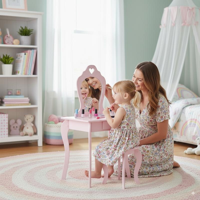 Da li vaša ćerka sanja o svom posebnom mestu gde može da se oseća kao prava princeza? Naš roze kozmetički toaletni stočić za devojčice je savršeno rešenje! Opremljen ogledalom u obliku srca, prostranom fiokom i udobnim tabureom, ovaj set će postati omiljeni komad nameštaja u sobi svake male dame. Toaletni stočić ne samo da oduševljava izgledom, već uči dete urednosti i pruža prostor za igru i razvijanje mašte. Najvažnije karakteristike i prednosti: Roze boja – savršena za sobu male princeze. Bezbedno ogledalo – izrađeno od materijala koji nisu staklo, bezbedno za decu. Tabure u kompletu – idealno prilagođen visini stočića. Prostrana fioka – za odlaganje kozmetike, ukrasa i drugih dragocenosti. Vintage stil i dekorativni detalji – prelepa dekoracija dečije sobe. Mogućnost pričvršćivanja za zid – veća stabilnost i bezbednost. Odlična ideja za poklon – osmeh i radost zagarantovani!