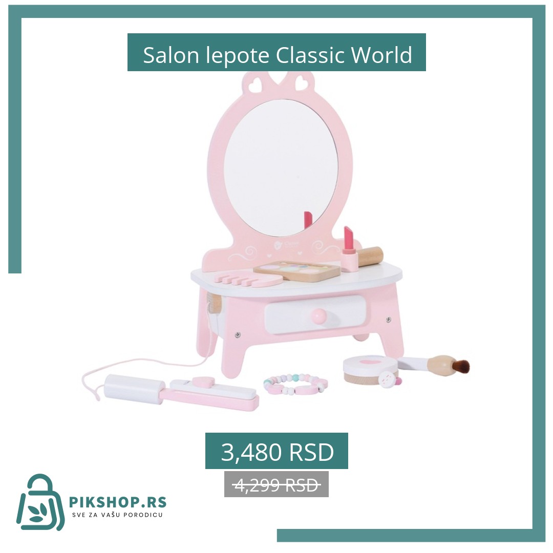 Uz drveni salon LEPOTE Classic World, svako dete će uživati! Ova edukativna i zabavna igračka podstiče kreativnost, maštu i socijalne veštine, dok mališani kroz igru uče da brinu o drugima i razvijaju samopouzdanje.