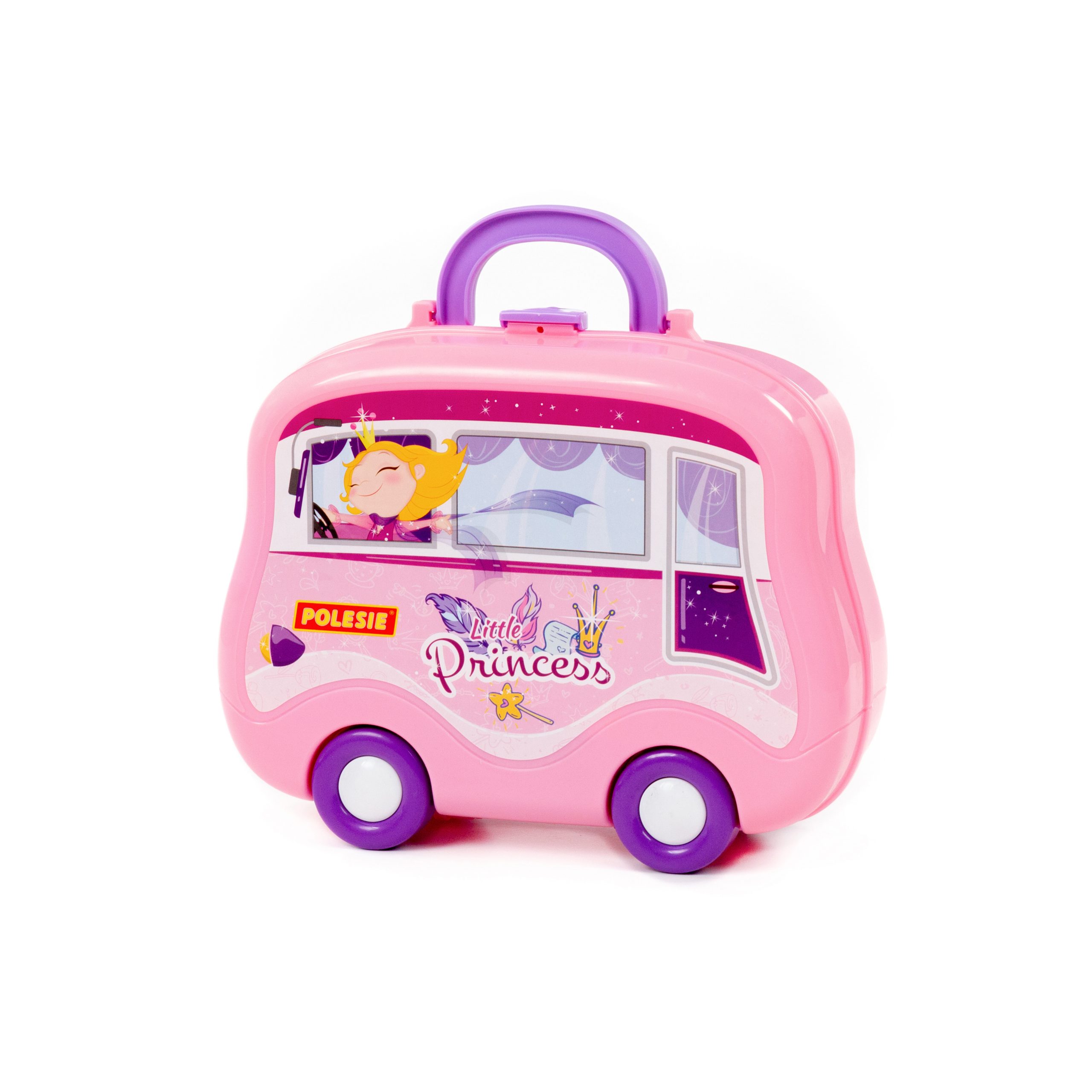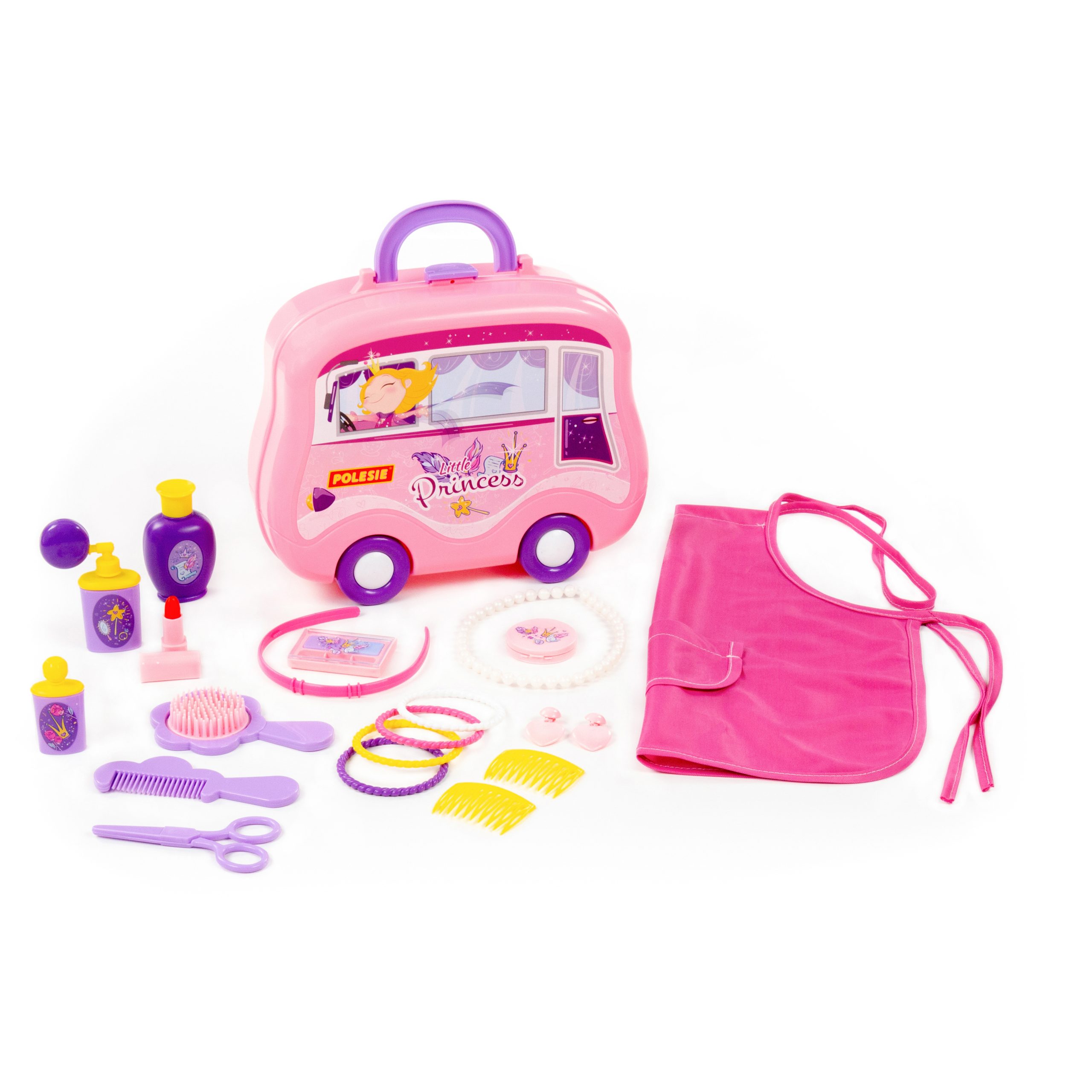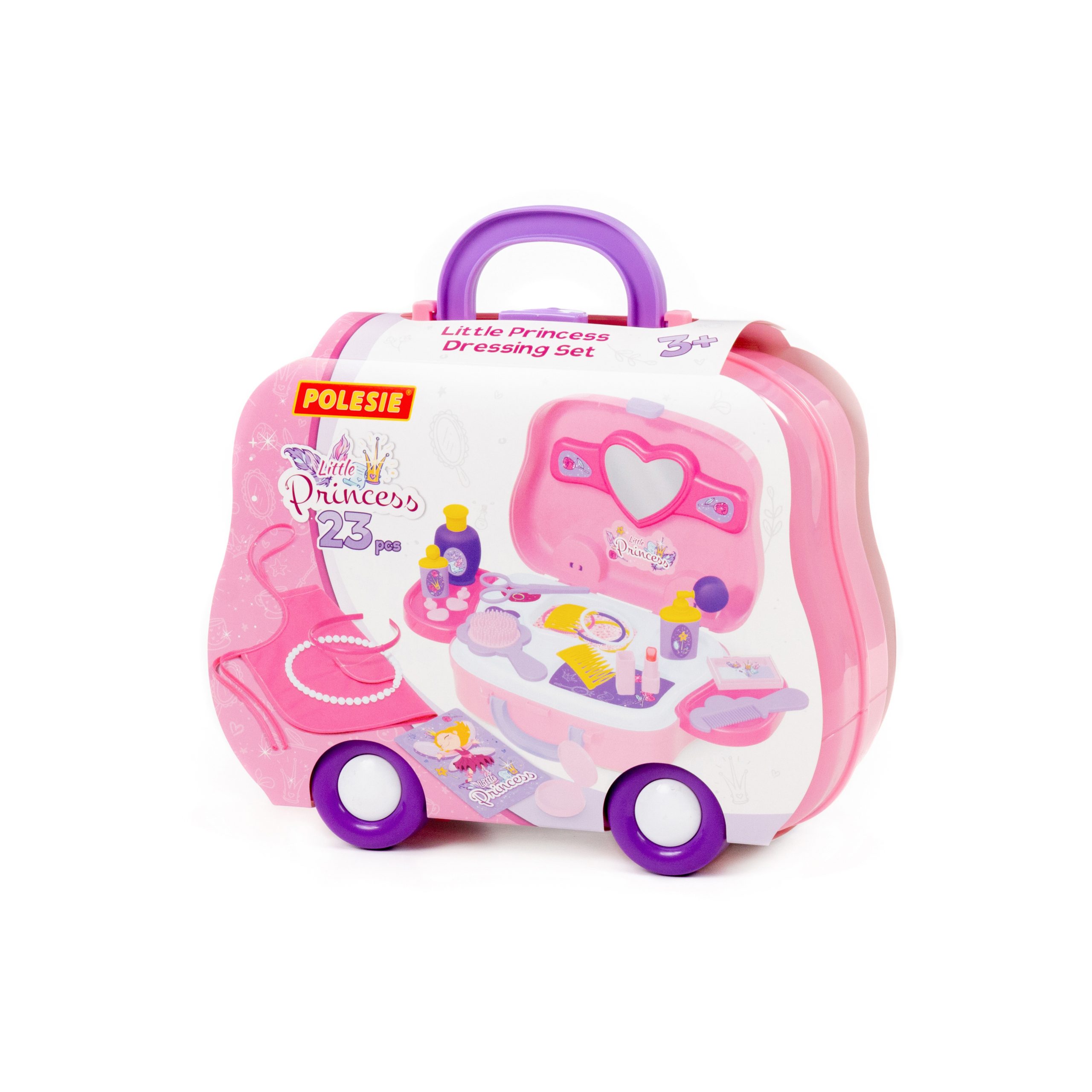 Set Mala princeza Polesie omogući će mladoj fashionistici da organizuje kozmetički salon kod kuće, na zabavi ili na ulici. Sav potreban pribor se sakuplja u mobilnom koferu na točkovima. Set sadrži 23 elementa: rajf za kosu – 1 kom .; ogledalo – 1 kom.; školjka – 2 kom.; narukvice – 4 kom.; kecelja – 1 kom .; klipovi – 1 par; perle – 1 kom .; ruž za usne – 1 kom .; set senki – 1 kom.; češalj – 2 kom.; makaze – 1 kom.; bočice za kozmetiku – 3 kom.; stol za pribor; bočne police (2 kom.); držač police. Dimenzije: 266х98х217 mm