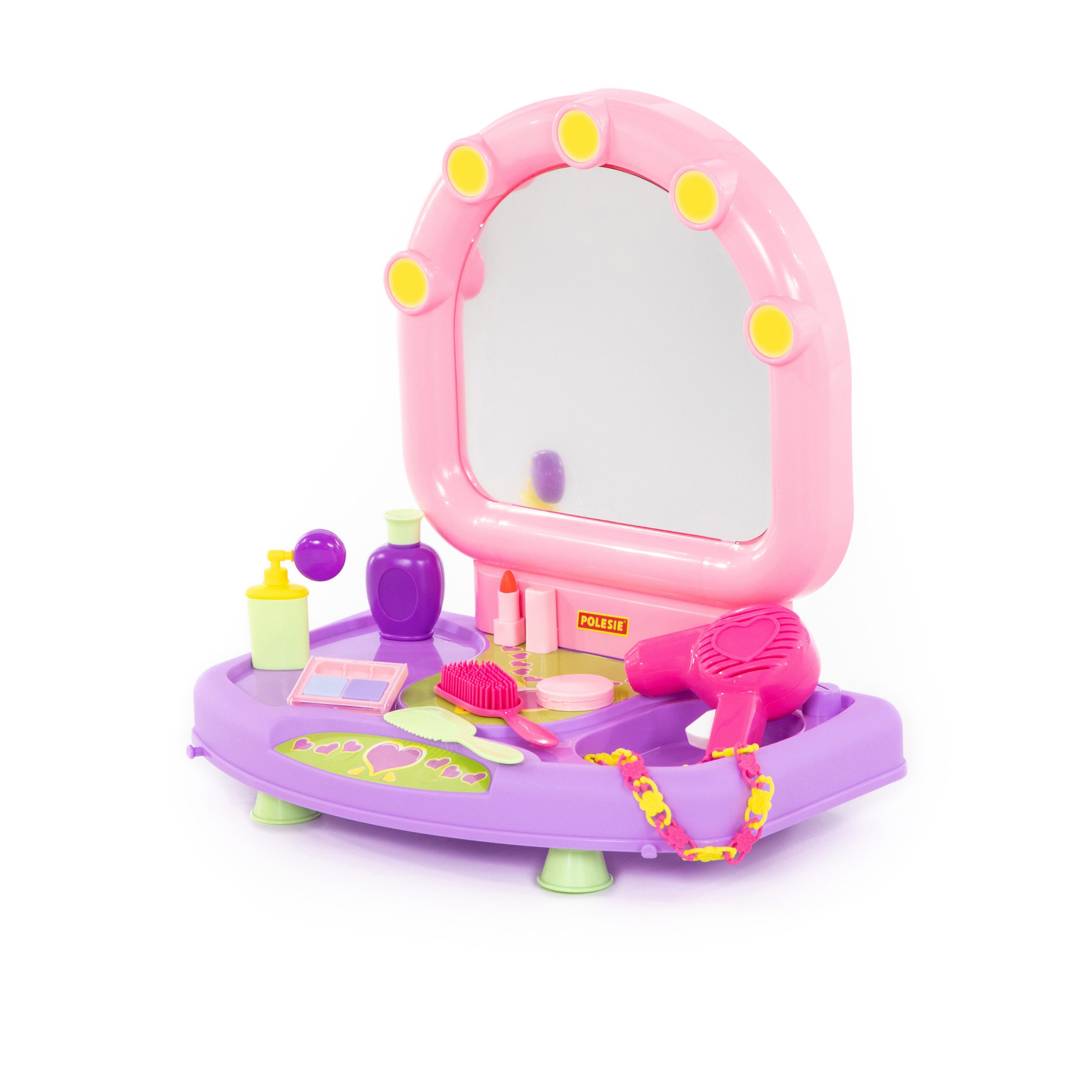 Mini toaletni stočić sa ogledalom i policom. Set uključuje dodatke za igračke: fen za kosu, češljeve (2 kom.), ogrlicu, kutiju za prah, senku za oči, ruž za usne, bočice za parfeme i drugu kozmetiku. Uz pomoć ovog seta, mala lepotica će moći da organizuje sopstveni kozmetički salon i isproba ulogu frizera ili stilista. Dimenzije 453x363x132mm sklopljeno 405х270х380mm