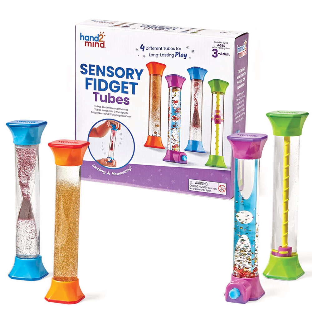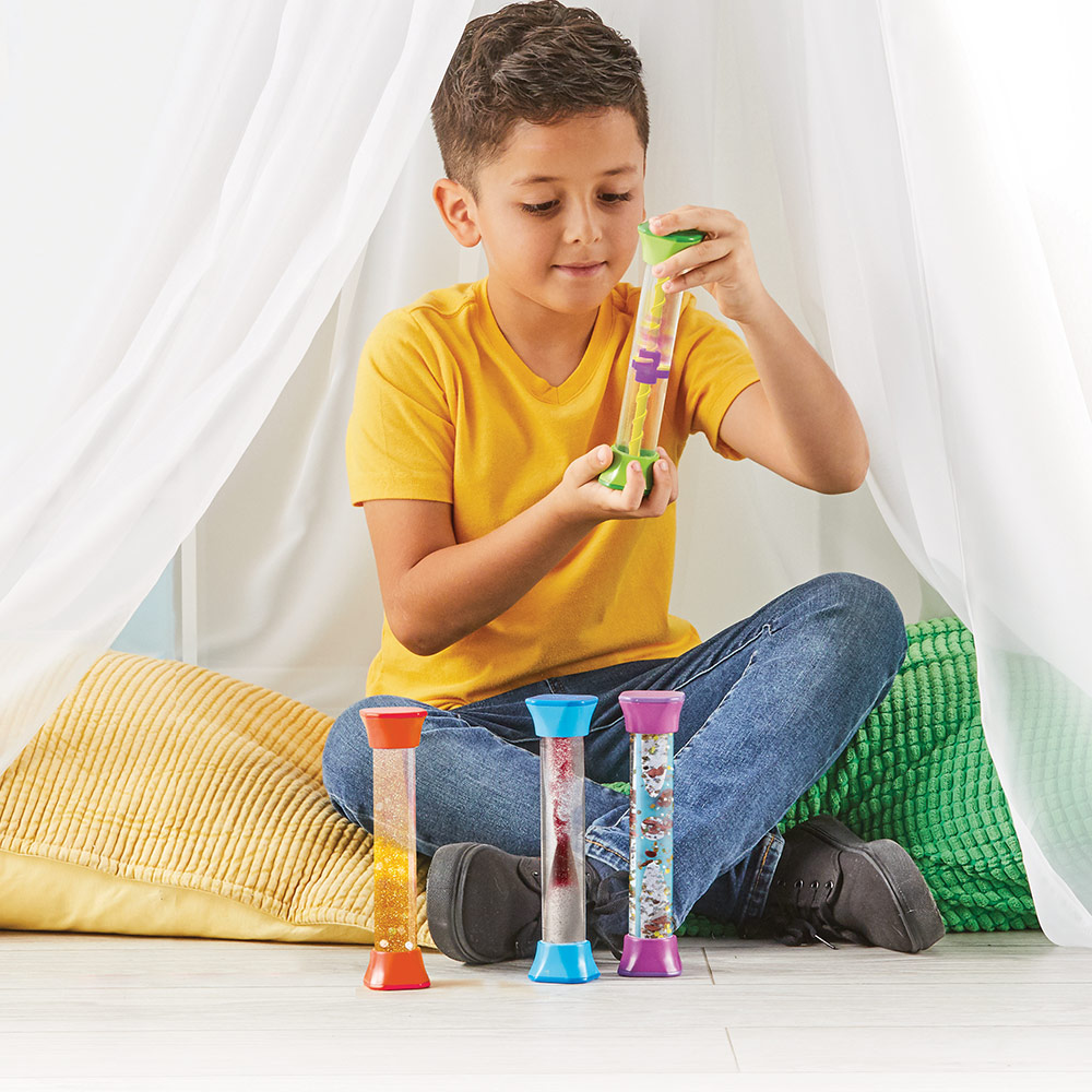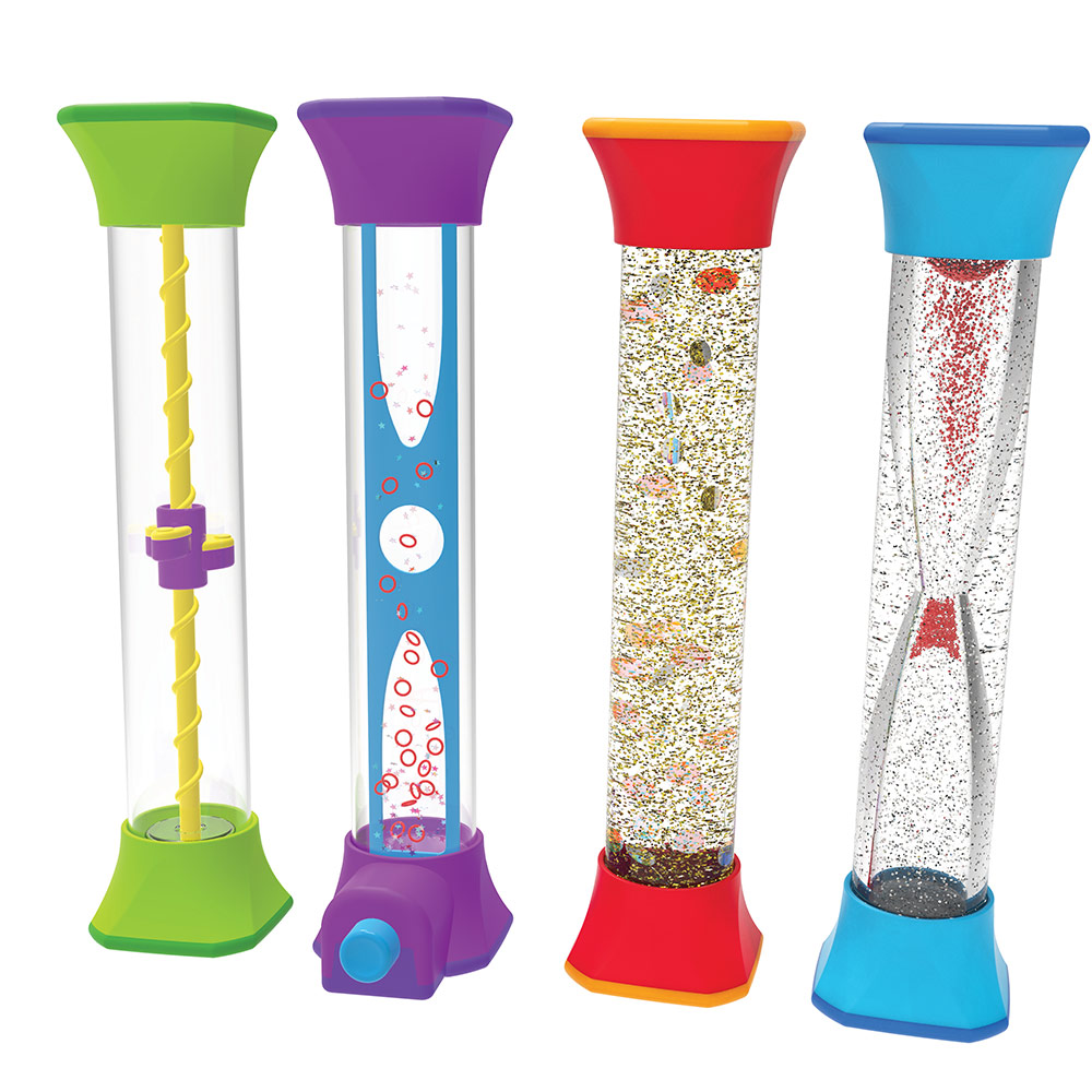 Set sadrži ukupno 4 tube, svaka sa jedinstvenim sadržajem u cevi: peščani sat, spiner i tube sa gliterom. Nagnite cevi, rotirajte ih i gledajte magične pokrete. Ove senzorne tube su specijalno dizajnirane za decu, tako da se lako drže i bezbedno su i trajno zatvorene. Idealno za kućne, vrtiće i školske učionice.Dimenzije jedne tube: 20 × 5 cm , uzrast: 3+