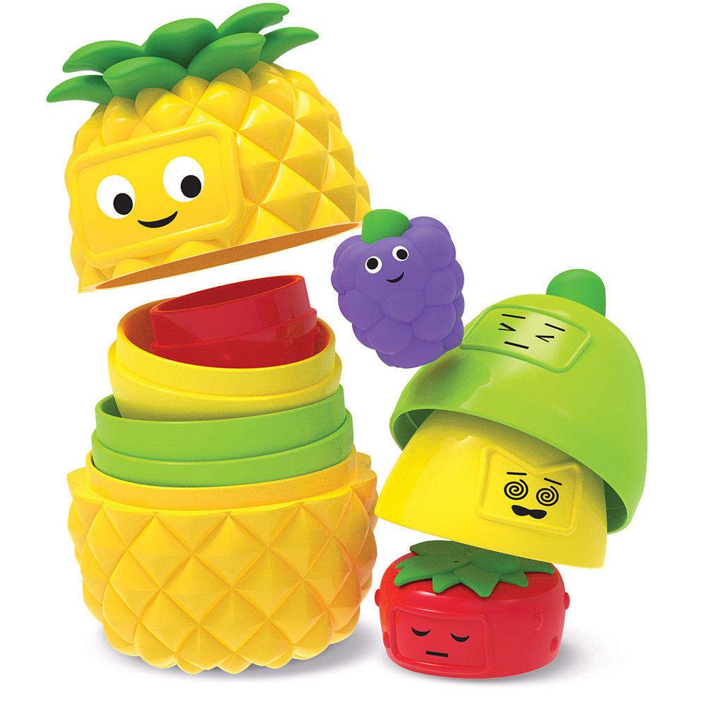 Set sadrži 9 elemenata – 5 voćki sa 10 oslikanih facijalnih ekspresija koje prikazuju različita osećanja i 4 postolja različitih boja (žuta, zelena, crvena). Od elemenata mogu se sasaviti limun, ananas, kruška, grožđe i jagoda. Dimenzije pakovanja: Uzrast: 18+ meseci