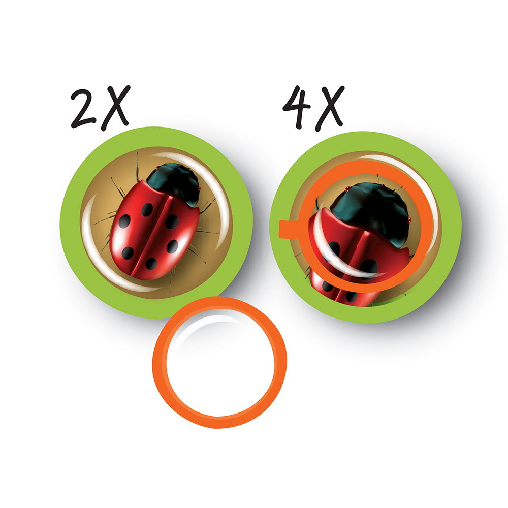 Dvostruka lupa sa remenom za vrat koji se može skinuti. Omogućava pogled na žive insekte zahvaljujući otvorima za vazduh. Takođe, može se posmatrati cveće, lišće i drugi mali predmeti.Uvecanja 2x i 4x.Dimenzije:7×7.5×7.5cm.Uzrast:3+