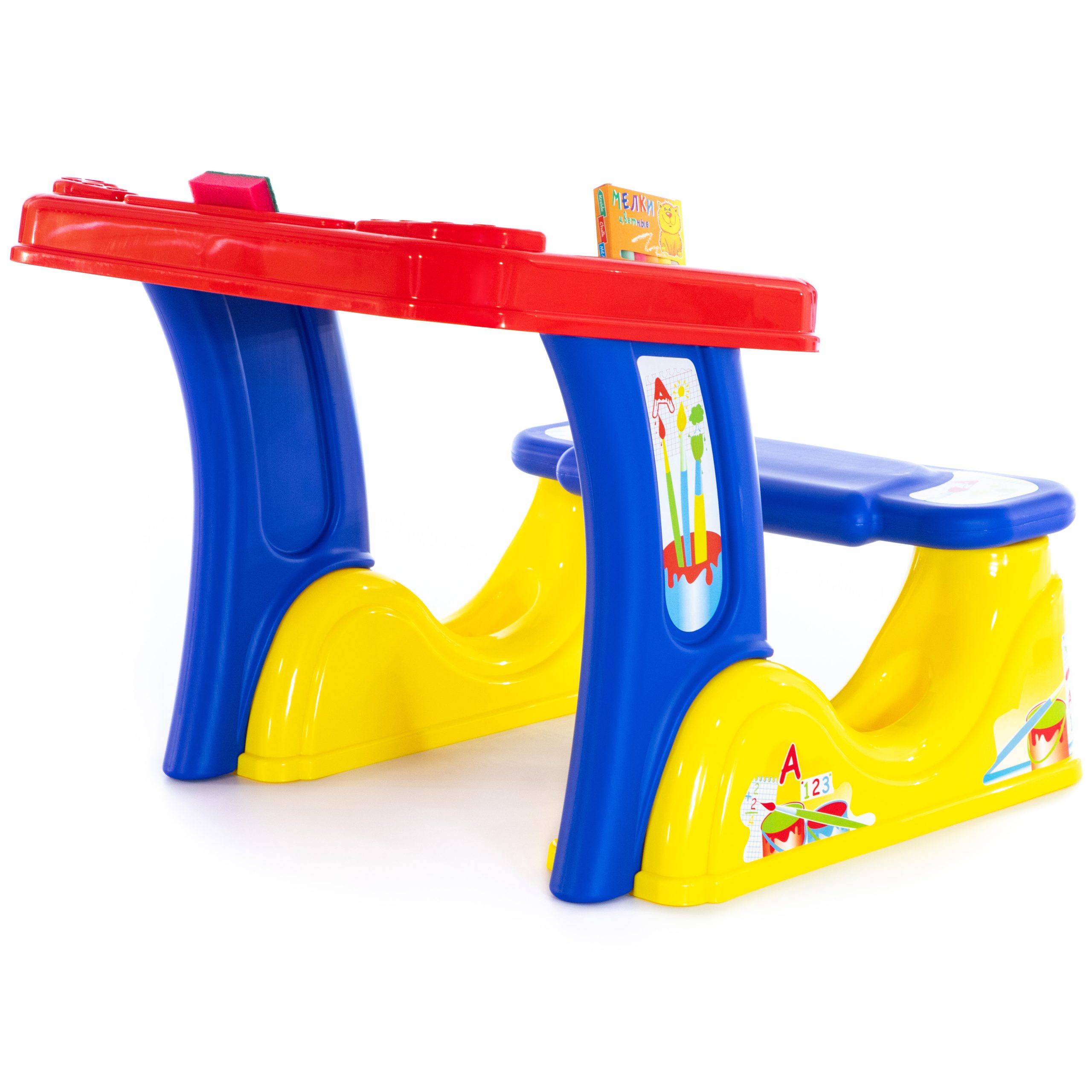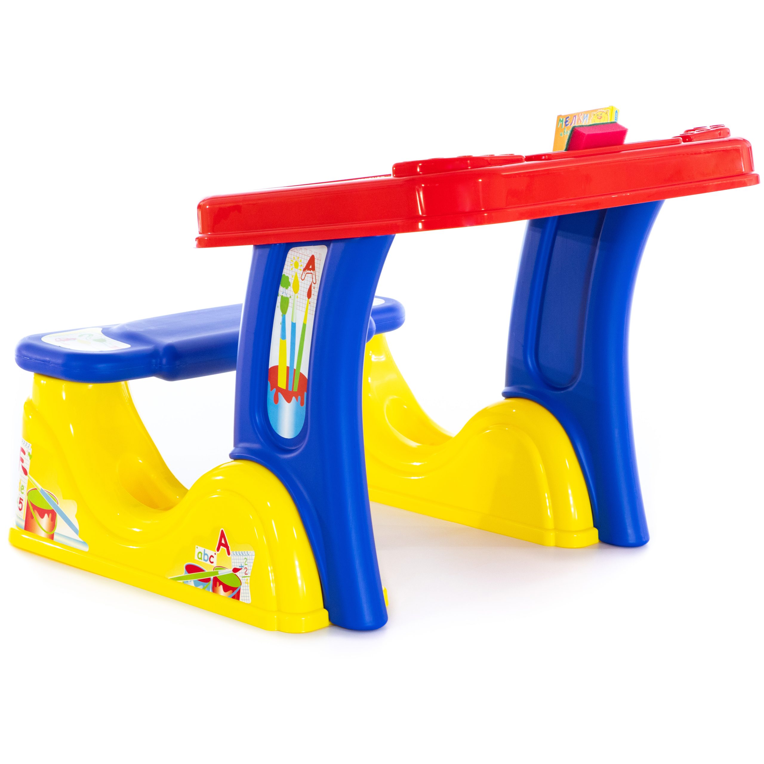 Radni sto se povezuje sa klupom. Površina stola je plastična ploča koja se može ukloniti, ispod koje se nalazi organizator za materijal za crtanje i pisanje. Na jednoj strani panela možete pisati markerom na vodenoj bazi koji se može izbrisati, a na drugoj bojicama. Uključene su bojice, marker i sunđer.