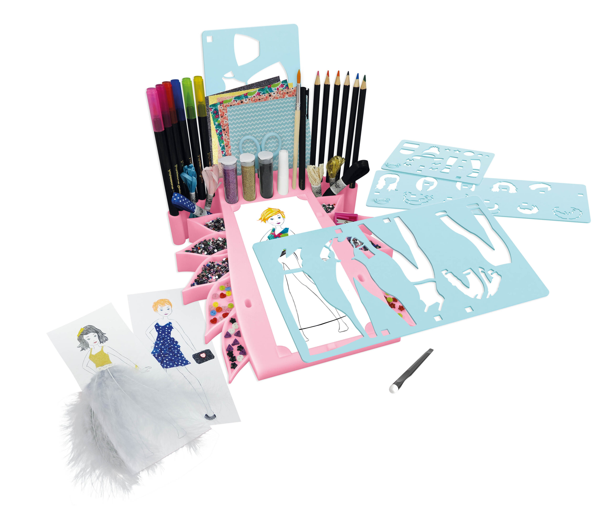 Upalite svetlo, stavite šablon i nacrtajte odeću po obrisima figure. Zatim ih ukrasite samolepljivim tkaninama, šljokicama i bilo kojim od mnogih drugih dodataka koji su uključeni. Ubacite frizure, vrhove, donji deo i obuću koju ste dizajnirali u knjigu – samo okrenite stranice i svaki dan možete imati novi izgled!