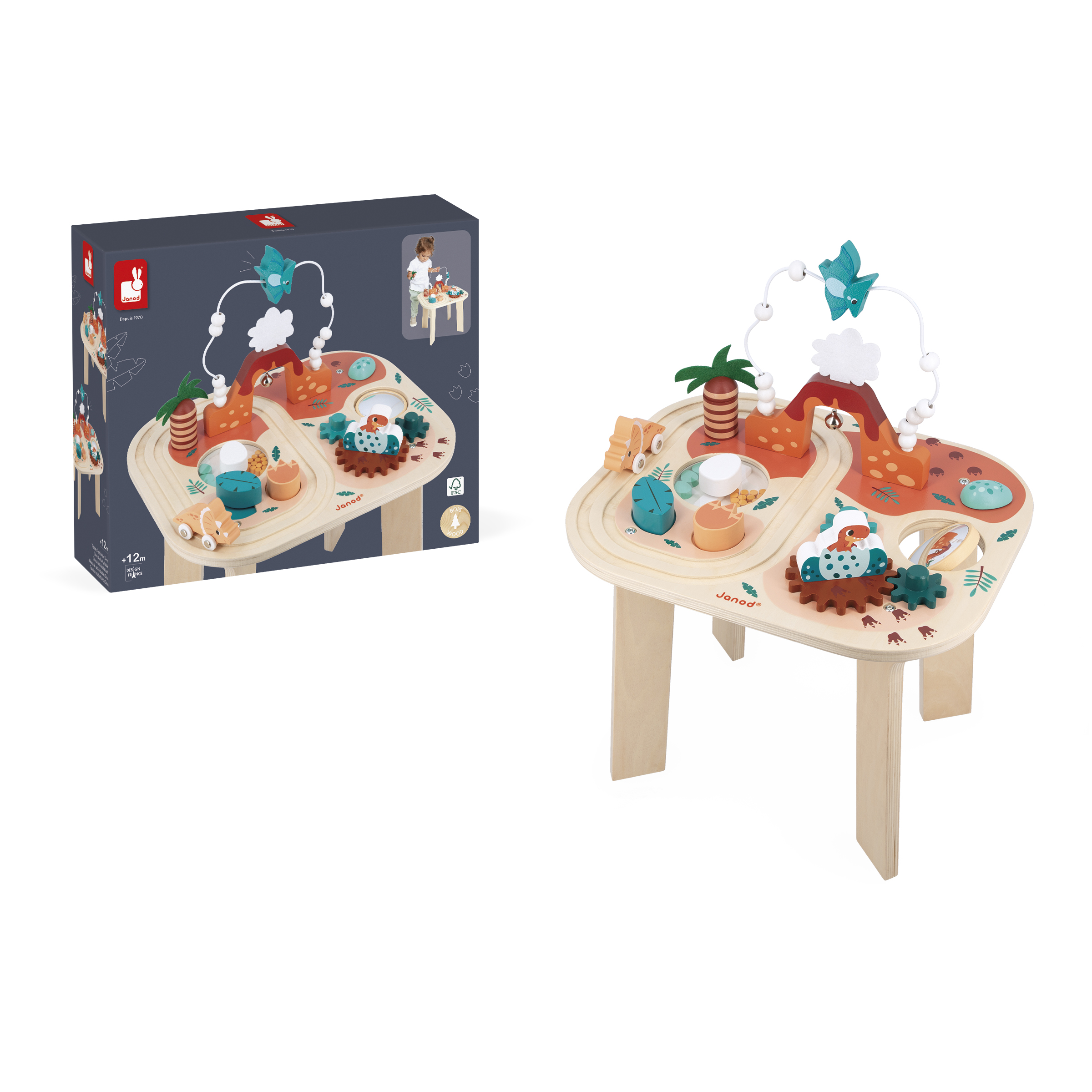 Vratimo se u praistorijsko doba, u vreme kada su dinosaurusi lutali zemljom, na veliko oduševljenje naših mališana! Na ovom veličanstvenom drvenom stolu za aktivnosti u rđavim i plavim tonovima, sve se spaja kako bi decu uzrasta od 12 meseci i više prenelo u jedan izvanredan univerzum: vulkan usred erupcije, bebe dinosauruse koji se izležu iz jaja, pa čak i leteća stvorenja! Dnevni raspored za ovo putovanje u srce jure – 8 različitih aktivnosti koje pomažu u razvoju bebine radoznalosti, motoričkih sposobnosti i koncentracije: triceratops koji se okreće duž svoje trake koja prolazi ispod vulkana da bi zvonio, abakus koji uključuje 10 drvenih perli i pteranodona u punom letu, igračka za slaganje od 3 dela u obliku palme, pa čak i drveni delovi u obliku otiska stopala i lista koji se ubacuju. Ova kompletna igra aktivnosti takođe uključuje dobro vizuelno iskustvo jer rotirajuće jaje pomera druga mala jaja u poslužavniku, plus postoje zupčanici, jaje koje proizvodi zvuk kada ga okrećete i iskrivljujuće rotirajuće ogledalo koje nasmeje decu. Svi detalji na ovoj prelepoj drvenoj igrački za rano učenje su vrhunski: različita područja za igru su odvojena lepim bojama, dim koji se diže iz vulkana je napravljen od veoma mekog filca, a oči dinosaurusa su toliko okrugle da ćete poželeti da usvojite jednog od njih! Ova igra je napravljena od FSC® drveta. Tabla je visoka 32 cm i počiva na 4 veoma stabilne noge.