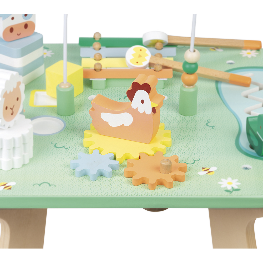 Krenite ka selu i njegovim poljima prelepog divljeg cveća sa ovim stolom za više aktivnosti, na kojem su prikazane sve bebine omiljene životinje sa farme! Zato, hajde da pokrenemo i pomozimo vašem detetu da otkrije 7 aktivnosti na ovom svestranom stolu za aktivnosti, uključujući: 2 životinje koje se mogu složiti na 2 različita načina za razvoj motoričkih veština; lavirint sa patkom koja šeta po svom jezeru, dizajniran da jača koordinaciju ruku i očiju; sklop zupčanika koji beba može da rotira da bi učila o uzroku i posledici, 3 ugrađene kocke za učenje oblika; abakus za razvoj koncentracije i metalni ksilofon sa 2 udarača za razvoj bebinih muzičkih talenata! Ovaj sto za rani razvoj će voditi decu uzrasta od 12 meseci i više od jednog otkrića do drugog u okruženju koje će obožavati! Visina stola: 32 cm. Boja na bazi vode.