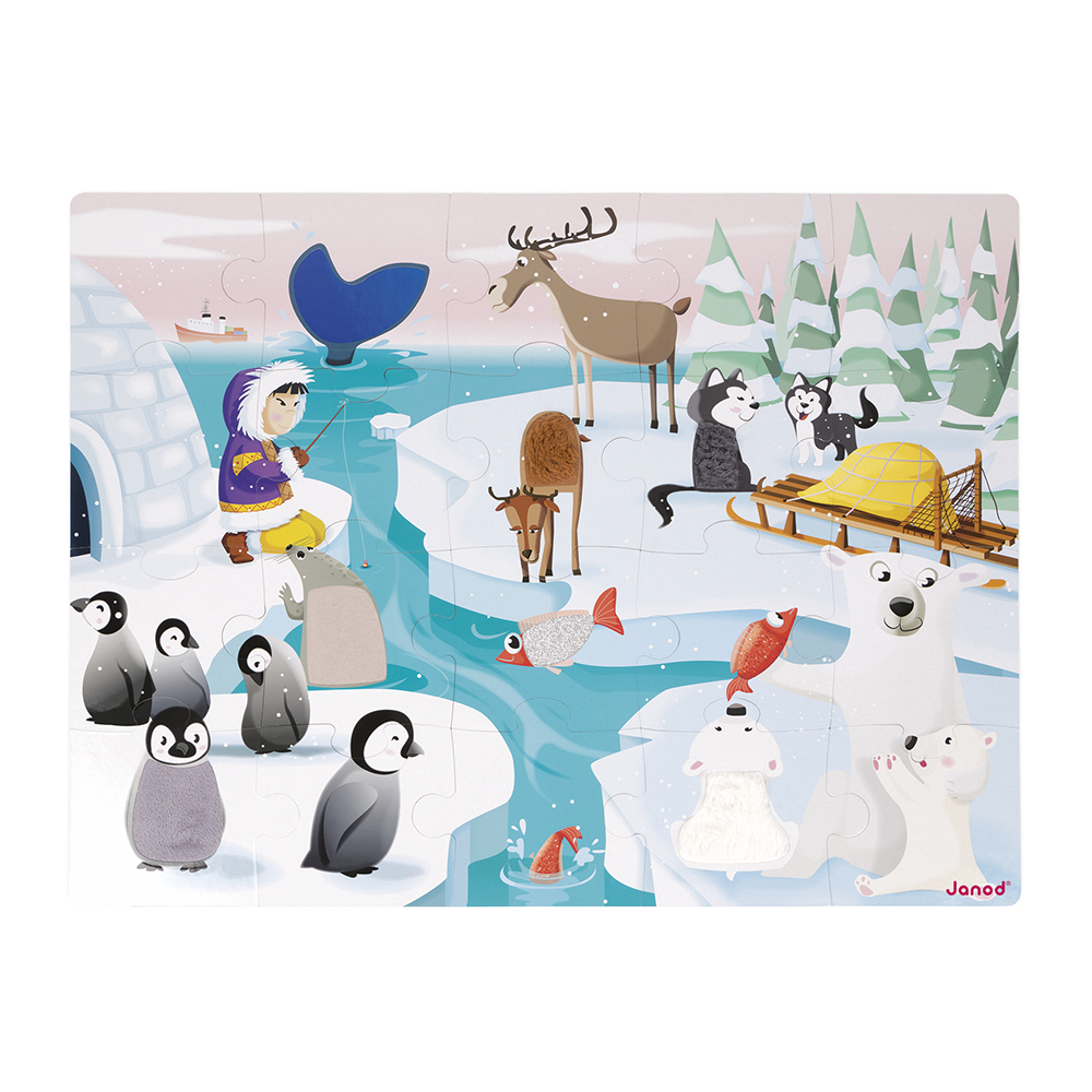 Džinovska slagalica od 20 delova u čvrstom kartonu, sa 7 delova sa teksturama (krzno za belog medveda, pingvina, jelena, psa haskija, lažni fok, metalni efekat za priču o kitovima, efekat šljokica za ribu). Ilustracija sa nežnim bojama na temu Život na ledu. Poster uključen. Ovaj proizvod je napravljen od FSC® sertifikovanog i drugog kontrolisanog materijala.