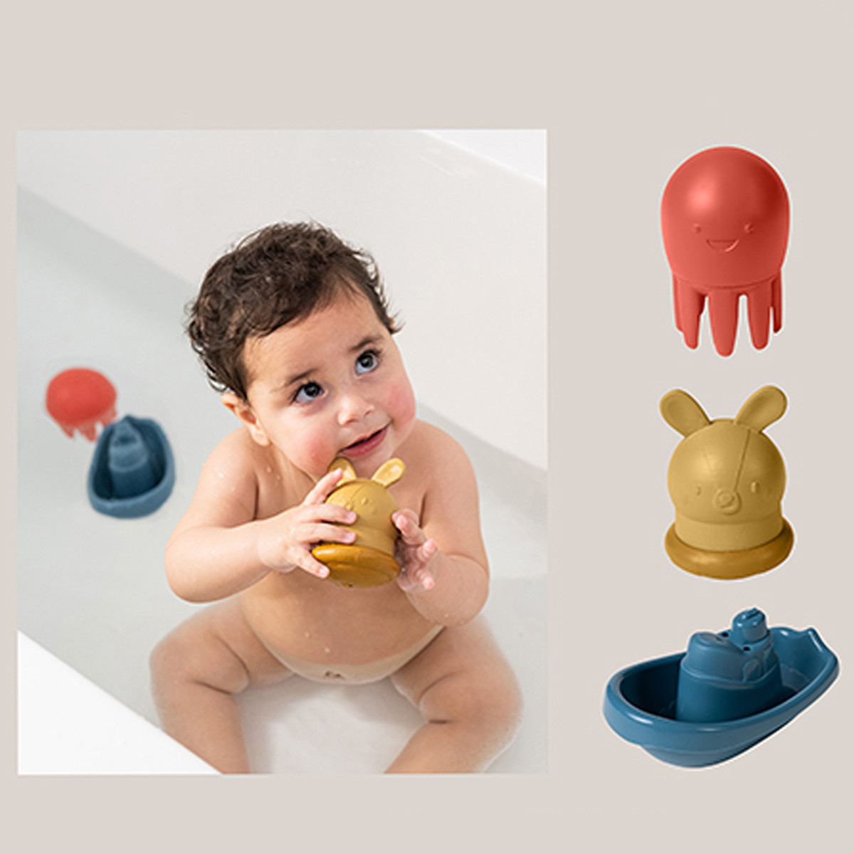 Igračke za igru u vodi: Dve silikonske igračke za prskanje i plutajući brodić osmišljeni da kupanje pretvore u veselu avanturu i podstaknu bebine čula.