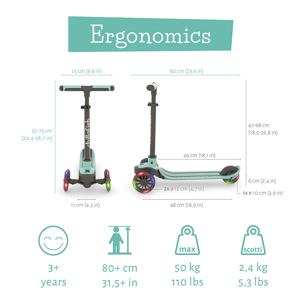 Skoti Glou je naša Čilafiš interpretacija klasičnog trotineta sa 3 točka, sada sa LED svetlima u volanu!! Ovaj lagani trotinet za decu uzrasta od 3 godine i više je reinvencija trotineta sa nagibom za upravljanje, sa našom prepoznatljivom tvintip platformom sa integrisanom kočnicom. Korman se skida u trenutku bez alata, tako da Skotija možete lako poneti sa prijateljima ili u park. Podesite visinu prema maloj deci i visokim prijateljima – korman se može podesiti od 52 cm do 72 cm (od zemlje).