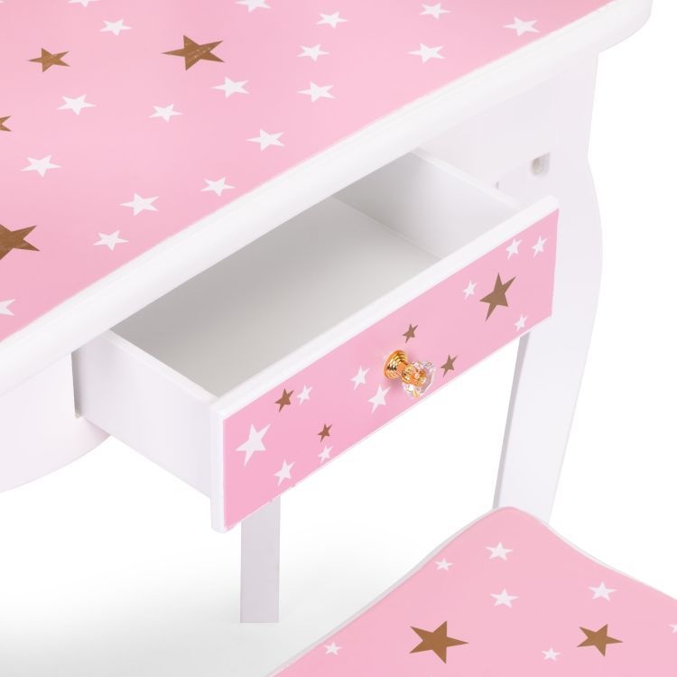 Toaletni sto ECOTOYS namenjen je deci starijoj od 3 godine. Njegov stilski izgled i čvrsta drvena konstrukcija obezbeđuju sigurnost i dugotrajnost. Najveći adut je trostruko ogledalo – glavno centralno ogledalo sa dva podesiva bočna panela. Roze ram sa zvezdicama i zlatnom krunom stvara zaista bajkovitu atmosferu. Ispod radne površine nalazi se praktična fioka sa ručkom – savršena za čuvanje malih blaga. Set takođe uključuje udoban tabure, savršeno prilagođen visini stola za svakodnevnu igru. Dimenzije stola: 30 × 59,5 × 99 cm Visina radne površine: 56 cm Dimenzije glavnog ogledala: 23,5 × 29 cm Dimenzije taburea: 26 × 26 × 35,5 cm PAKOVANJE Proizvod je upakovan u ojačanu transportnu kutiju, a svi elementi su pravilno osigurani kako bi se sprečila oštećenja tokom transporta. Dimenzije pakovanja: 66 × 34 × 30 cm Težina: 10 kg