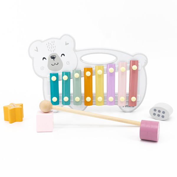 Viga PolarB drveni ksilofon Meda je sjajna igračka iz kolekcije muzičkih instrumenata. Ksilofon zvuči lepo i nežno, i ima prijatnu boju zvuka. Instrument ima originalan dizajn – oblik medveda, kao i svetle boje. Komplet sadrži i 1 štapić.