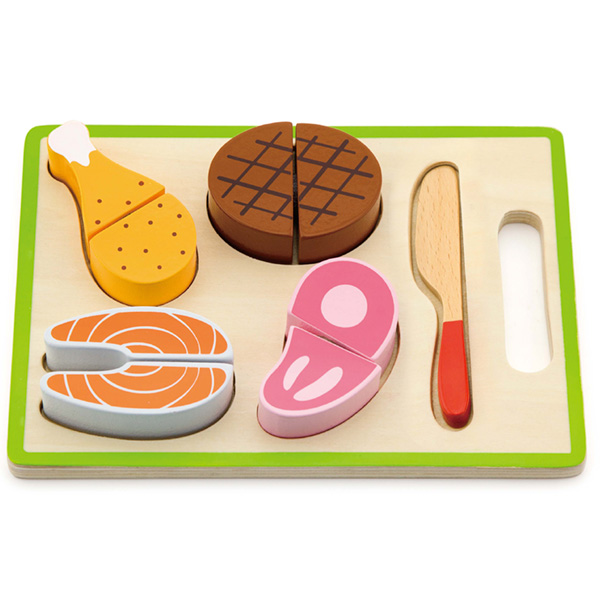 Drveni set večera sadrži 4 vrste mesa koje se može prepoloviti, a čiji su delovi spojeni uz pomoć čičak trake.