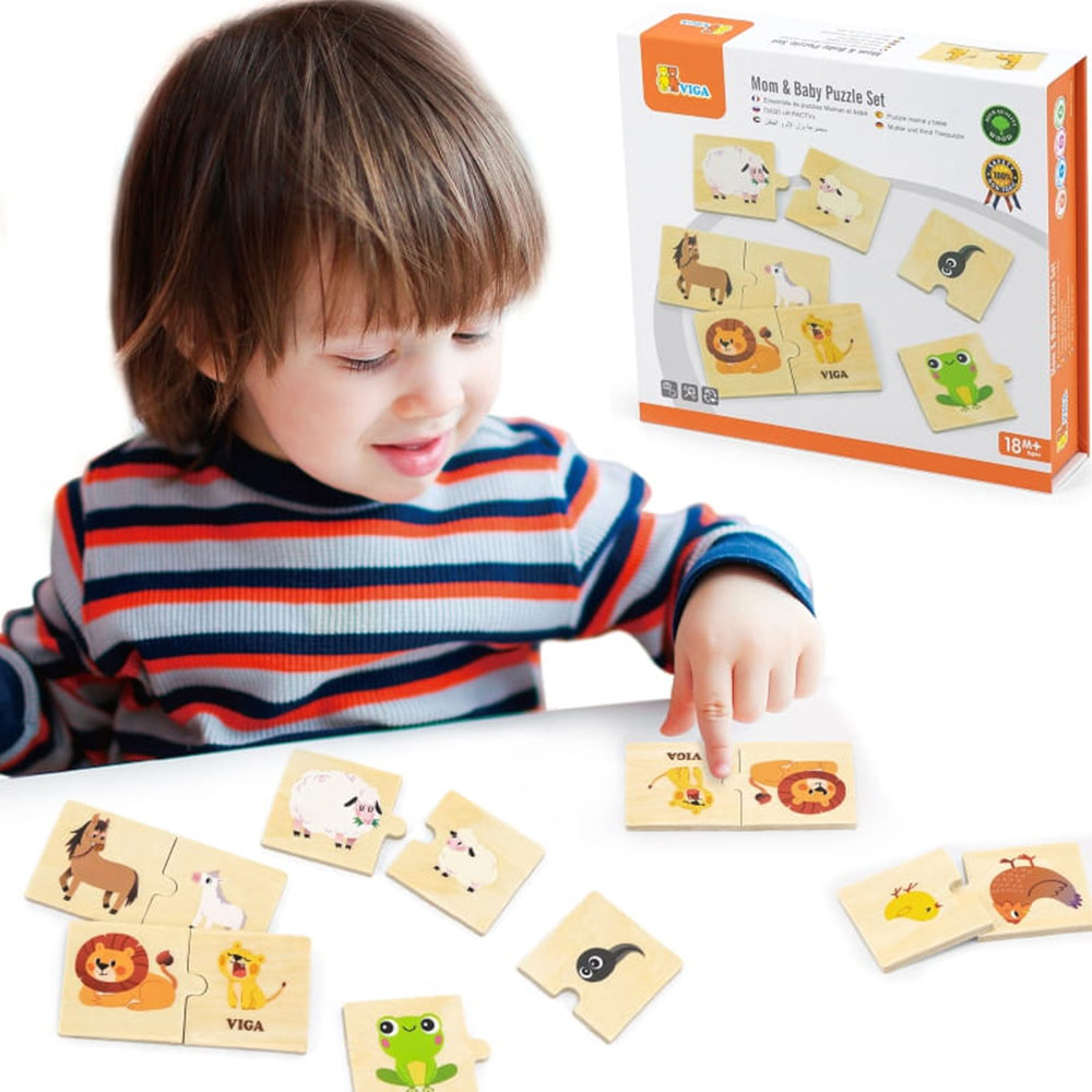 Viga set sa tematikom životinja, majke i mladunčeta. Set se sastoji od 24 drvenih kartica, 12 pari različitih životinja majke i mladunčeta koje je potrebno spojiti u slagalicu. Na ovaj način deca razvijaju mišljenje, upoznaju se sa različitim životinjama i uče o njihovim mladuncima. Podstiče finu motoriku i socijalnu inteligenciju.