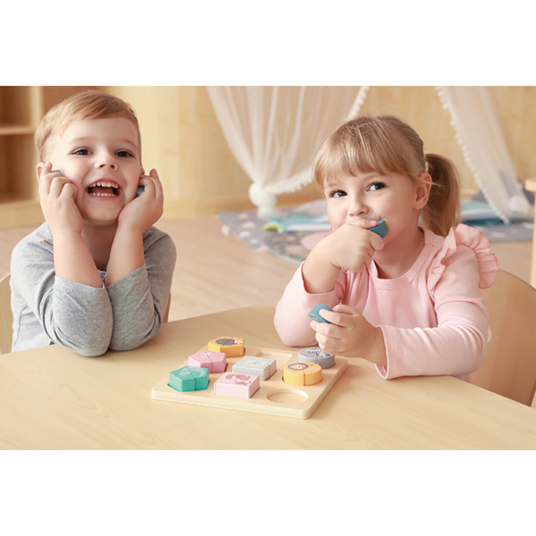 Deca treba da naprave sliku od dve polovine, a zatim umetnu dobijenu geometrijsku figuru u odgovarajuću rupu na drvenom postolju.