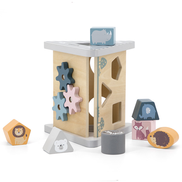 Petostrana trouglasta kutija sa 7 različitih oblika. Poboljšajte bebinu sposobnost prepoznavanja oblika i koordinaciju ruka- oko , okretanjem zupčanika.