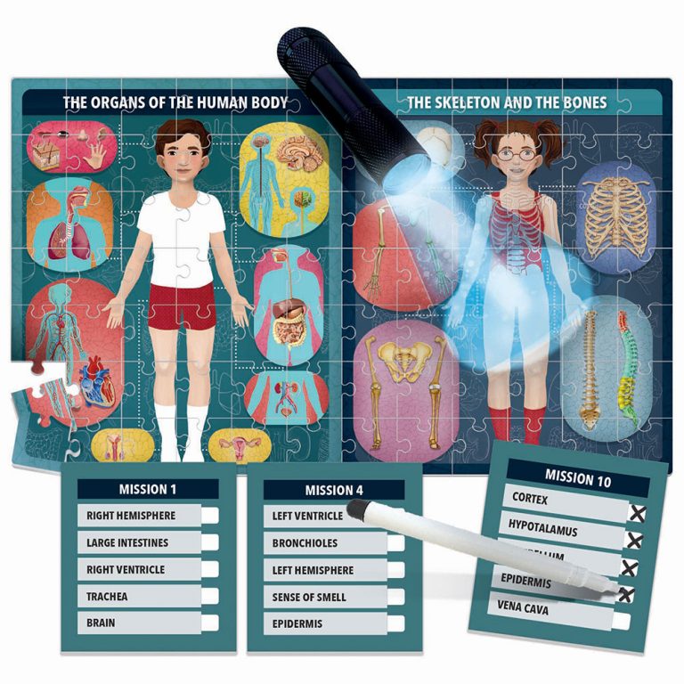 2.279,00 RSDHeadu edukativna igra otkriva zanimljive detalje o organima, kostima, tkivima, a zatim pomoću lampice koja dolazi u setu moguće je poput rendgena istražiti svaki deo tela pojedinačno.